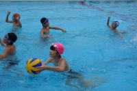 プールの中にゴム球や輪っかなどを入れ、たくさん集めたほうの勝ちとなります。