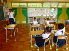 ↑ 昼休み、比較的涼しいので、体育館でドッジボールを楽しんでいます。昼サポートさんも、一緒に1年生とボール遊びをしてくれました。掃除の指導サポートもありがとうございます。大変助かります。