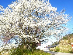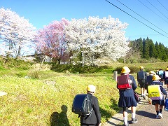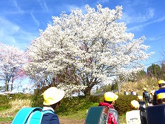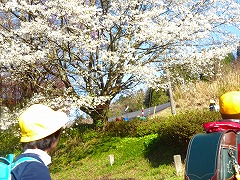 ↓ 歴史を感じる大木の桜は見事です。花弁と遊ぶ笠野っ子、ほほえましい光景です。