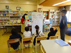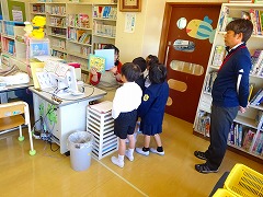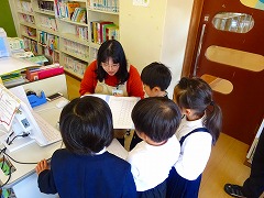 ↑ 1年生 学校司書さんに本を読んでいただきました。そして、PCによる本の借り方、返し方を教わりました。楽しい本、面白い本、不思議な本等たくさんそろっていますので、どんどん借りて読んでください。
