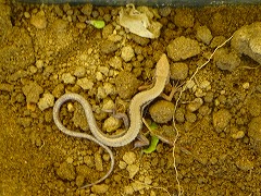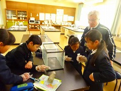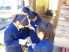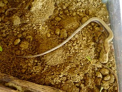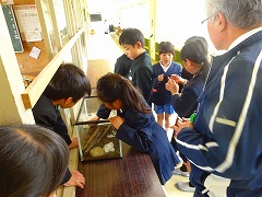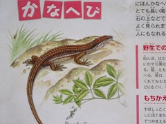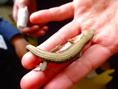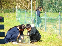 ↑ 4年生がお世話しているかなへび君は、大人気です。すばしっこいですが、上手につかんで観察しています。