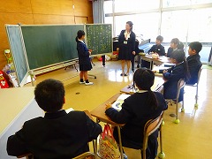 ↓ 英語 5,6年生 今年から、ALTの先生が、お二人来てくださることになりました。2020年からの外国語の授業全面実施に向けて、今年もしっかりと力をつけていきます。目を見て、英会話を楽しんでいます。