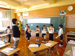 ↑ 2年生が1年生を迎える会を開いてくれました。ふきのとうの音読劇を見せてくれました。最後の感想を伝え合う場面です。たくさんの子が自分から素敵な感想を伝え合い、心が温かくなりました。