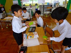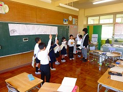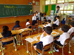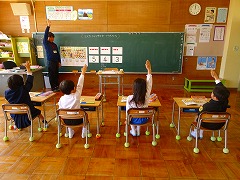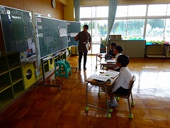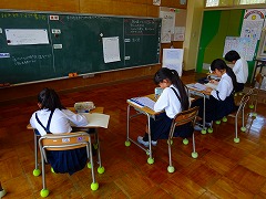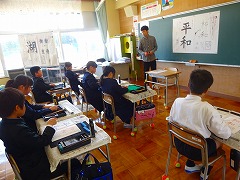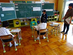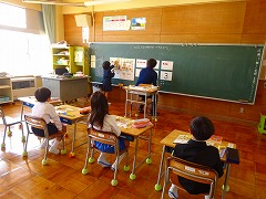 ↑3年生は算数の学習をしています。同時に4年生は同じ学級で算数の学習を進めます。担任は「渡り」といって、両学年を行き来して授業を進めます。担任は2学年分の準備をして授業に臨んでいます。いつも担任がついて進める授業ではありませんので、自分たちで考え、話し合う主体性がさらに必要とされます。複式学級なので致し方ありませんが、それを強みに変え、子供たちの自分から学ぶ力を育てています。これは、今求められている力なのです。