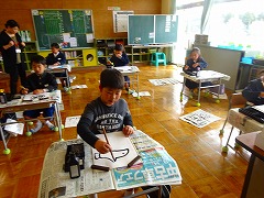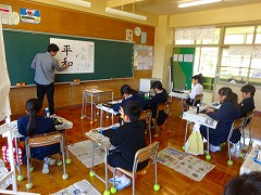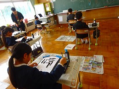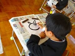 ↑ 3,4年習字 3年生は初めての習字です。筆づかいを確かめながら、すきなイラスを描きました。4年生は、始筆、折れ、はねの学習です。