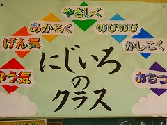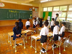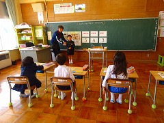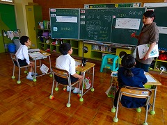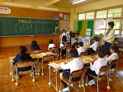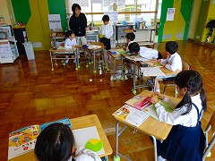 ↑ 1年生は勉強がスタートしています。この時間は算数で、ブロックと数字と、イラストを対応させて、数の概念を育てています。生活の中でも、たくさん数えてください。お皿でも、指でも、数字のカウントダウンでも・・・学校では意欲満々で、楽しく算数の学習をスタートさせることができてます。