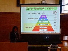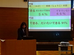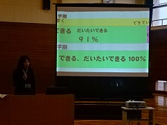 2学期までの児童の授業アンケート「できたかなカード」の集計を紹介しました。「自分の考えを書いている」「ならった漢字を使って文章を書いている」は1学期末の7月は、それぞれ91%、83%の笠野っ子ができていると回答していましたが、2学期末の12月には、なんと100%の笠野っ子が「できている」と回答しました。素晴らしいことです。引き続き、3学期もがんばりましょう。