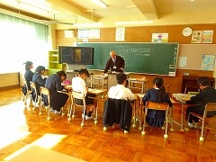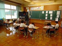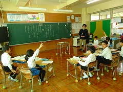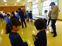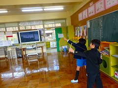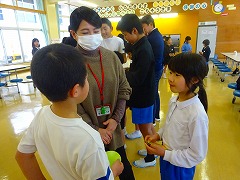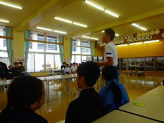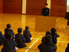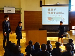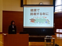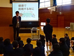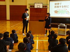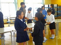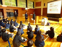 ↑ 1月の生活目標「気持ちのよいあいさつをしよう」のお話をしました。相手が気持ちよくなるあいさつはどんなあいさつか、児童の意見を聞いてみました。「相手の目を見てあいさつをする」「名前を付けてあいさつをする」「先にあいさつをする」「えがおであいさつをする」等、しっかり分かっていました。1月はこの挨拶をみんなで実践し、あいさつの輪をさらに広げたいと思います。