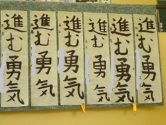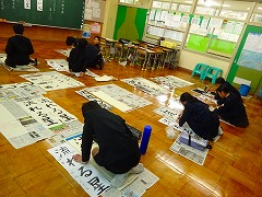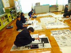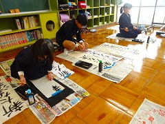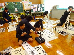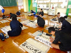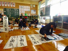 ↓ 始業式の後、教室で一斉に書初めを行いました。心を落ち着けて、すがすがしい気持ちで紙に向かいました。