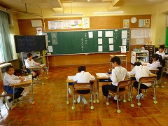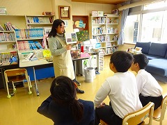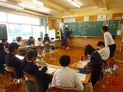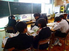 ↑ 6年国語 学校司書さんの、ブックトークをお聞きしました。「自然に学ぶ暮らし」の教材文を通して、筆者の考えをとらえ、自分の考えと比べる学習を進めていきます。ブックトークのおかげで、自然が生活の中にどのように生かされているのか、興味関心が高まりました。自然に関する本の読書を進めてほしいと願っています。