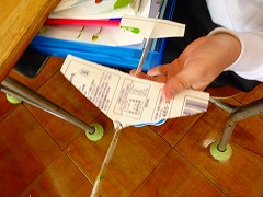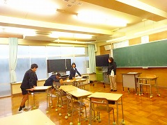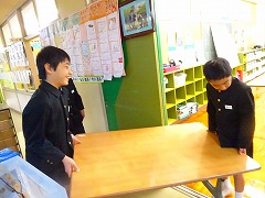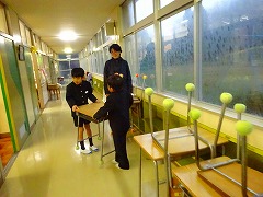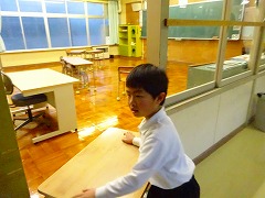 ↑ 登校後、すぐにワックスがけのために廊下に出ていた机などを教室に入れました。感心したことに、自分の教室以外の近くの教室の手伝いに進んで参加していることです。素敵な心をありがとう。