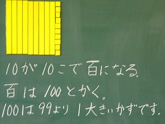 ↓ 1年算数 いよいよ3桁の大きい数の学習です。100とはどんな数か、図を見て説明しました。
