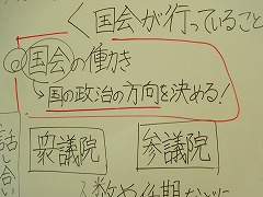 ↑ 6年社会 国会の働きについて学びました。選挙権は18歳以上となり、選挙は子供たちにとって一段と身近なものとなっています。