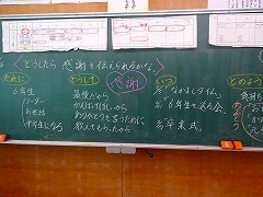↑ 1月のみんなで話そうタイムのテーマは「どちらの挨拶が気持ちがいい?」です。「自分から先に挨拶をする」と「相手から先にあいさつしてもらう」ときと比べて考えました。心情円盤を使いながら、それぞれの理由を話していました。最後に全体で心に残った話を紹介してもらいました。すると、「先にあいさつされると、先を越されたなという感じになる」、「上級生だから、先にあいさつをしないと下級生のお手本にならないと思う」、「挨拶をして、返ってこないと挨拶するのが怖くなるから、相手にそのような思いをさせてはいけない」、「挨拶が返ってくると、相手に認められているという感じでうれしくなるから、自分も笑顔で挨拶を返したい」等、挨拶への思いを語り合いました。明日からの挨拶に今日感じたことを生かしてくれることでしょう。