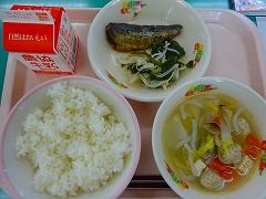 ↑ 今日の給食です。今日はいわしのごま味噌煮、酢の物、鶏団子の塩鍋でした。塩鍋なのに、甘さを感じ、とてもおいしかったです。