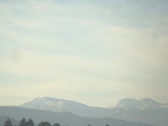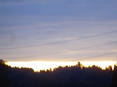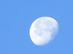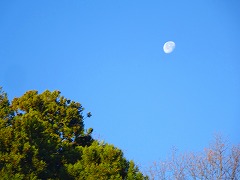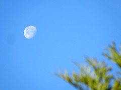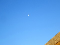 ↑東の空には輝かしい朝日、南西の空には月齢19の下弦の月が輝いています。