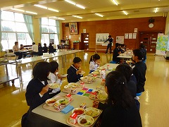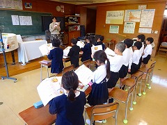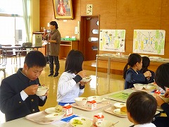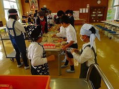 ↑ 今年の給食もあと2回です。1年生はとても手際よく給食当番をしています。5年生のサポートも上手なのでしょうね。