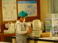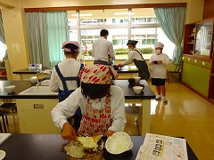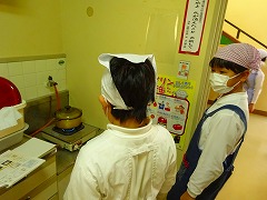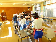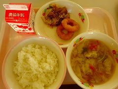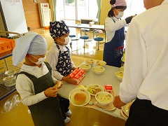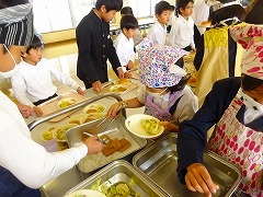 ↓ 給食当番 1年生の給食当番です。2週間目に入り、手際よく配膳をしています。今日はクラムチャウダーとフィッシュバーガーとキャベツのソテーでした
