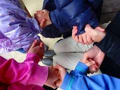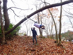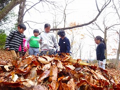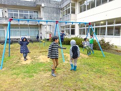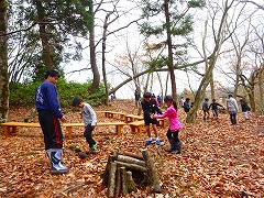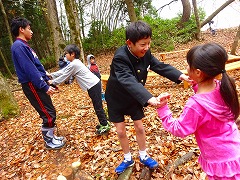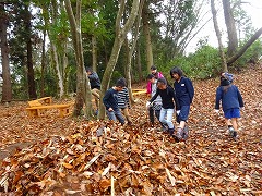 ↑ 自然ふれあいタイム、昼休みと掃除時間を利用して、自然と触れ合いました。人気のターザンロープや天然トランポリン、幹の1本道や落ち葉集めをして冬の森を楽しみました。