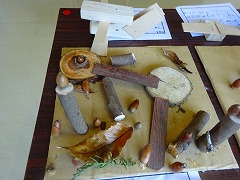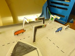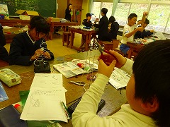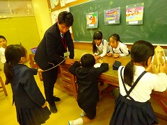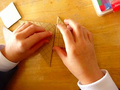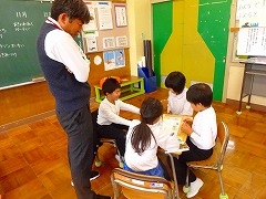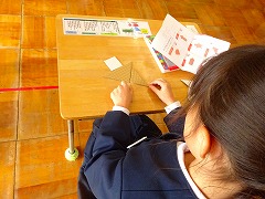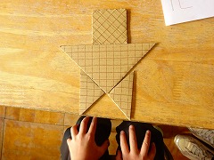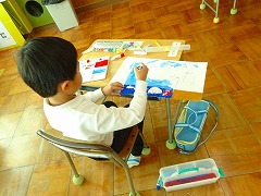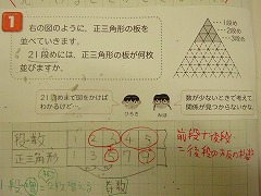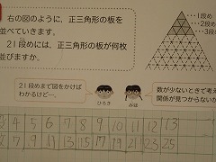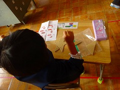 ↑ 1年生算数 形づくりの学習です。三角と四角の板を組み合わせて、紙に書いてある形づくりにチャレンジしています。