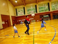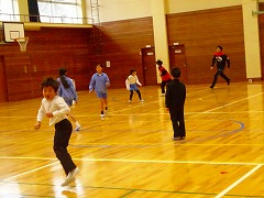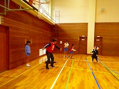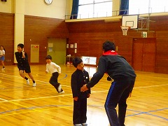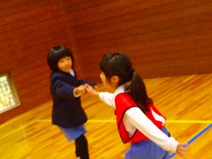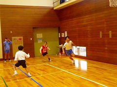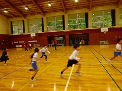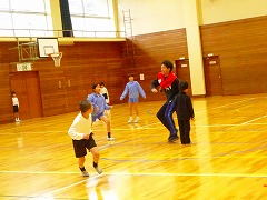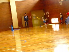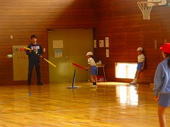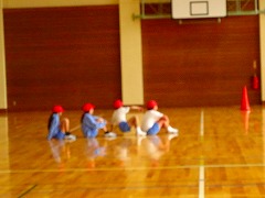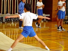 ↑ 3,4年体育です。Tボールゲームです。守りはボールを掴んで全員1列に並んで座ると、攻める側はもう走ることはできません。攻める側は守りのいないところに打つ、守る側はすばやくボールを掴んで1列に並んで座ります。広い体育館で思いっきりプレーできました。