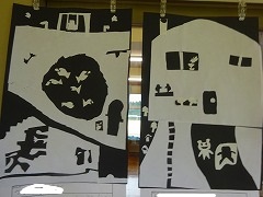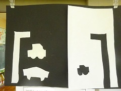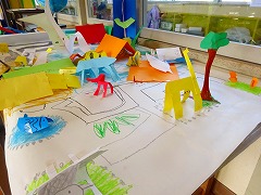 ↑ 2年生の図画工作の作品が仕上がりました!「はさみのアート」、ちょきちょき紙を切って、いろいろな形をつくり、できた形から想像を広げ、作品に仕上げました。創造力が培われます。