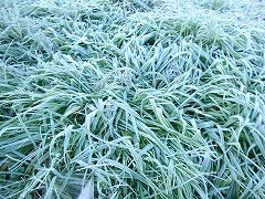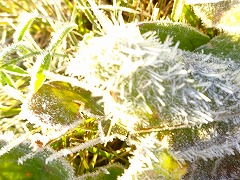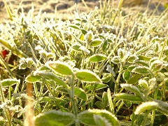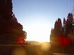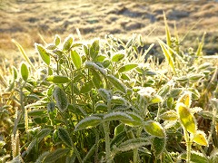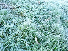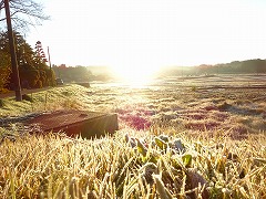 ↑今朝は、草木の息吹で真っ白に霜が降り、その霜に朝日が当たり一面ダイヤモンドの輝きの里となっています。