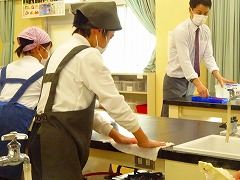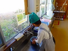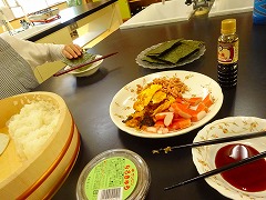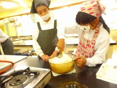 ↑ 炊けたようです。部屋中においしいご飯のにおいが漂っています。手際よく混ぜています。手の空いた人は、自分から仕事を見つけ、目立たない仕事も進んでみんなのためにしています。↓