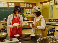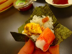 ↑ 市谷米で手巻き寿司づくりです。コメの分量を量り、適量の水を入れて、上手に炊きました。炊き上げたごはんを混ぜ返し、湯気を飛ばし、ホカホカごはんの出来上がり。そこに具を入れて、手巻きずしの出来上がり!試食させていただきました。とにかくごはんがおいしくて、どの具を入れても、とても合いました。特に手作り卵巻きはまろやかさを増しました。3年生全員でいただき、会話も弾みました。