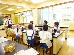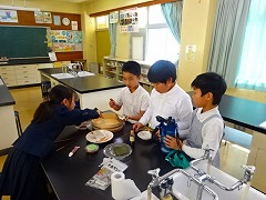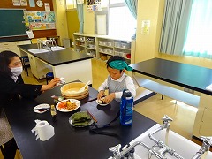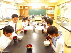 ↑ 試食タイムです。担任曰く、水加減と火加減のあんばいが大変よく、これほどよい炊き具合になることは、めったにないということでした。確かにお米がふっくらと立って、ちょうどよい炊き具合で、さらに、おこげが少しあって香ばしく、ごはんってこんなにおいしいのかと改めて感動しました。味噌汁は、大根のいちょう切りと油揚げの短冊切りが美しく、だしの煮干しは頭や内臓がきれいに除去され、上品なうまみのあるものに仕上がりました。5年生のチームワークと丁寧さ、そして、頼もしさを感じる調理実習でした。ごちそうさまでした。