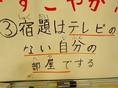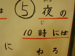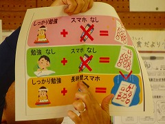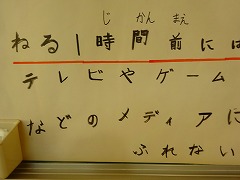 ↑ 1週間の健康チェックの結果を見て、規則正しい生活について考えました。メディアとの付き合い方を考えなければならないという課題が浮かび上がってきました。めあては笠野っ子が決めた「笠野っ子健やか憲章」です。ゲームについつい大事な時間を奪われては、健康にも学校生活にもいい影響は出ません。各自が考えなければならない課題です。