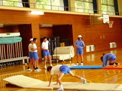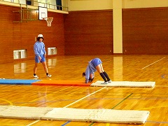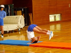 ↑ 5.6年マット運動 コツをアドバイスしながら練習しました。手の動き、頭の付ける位置、足を伸ばすタイミング等、いろいろ見つけたようです。