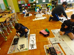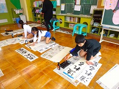 ↑ 3.4年生書初め練習です。今日はいよいよ本番の大きさの紙で練習しました。バランスを考えて力強く書きました。