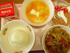 ↑今日の給食は、皿うどんと肉まん、珍しいメニューに大喜びです。