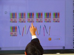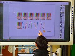 ↓ 1年算数 自分の考えを出し合い、理由を説明しています。どれが正しいか、納得できたでしょうか。ICT活用も効果的です。