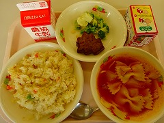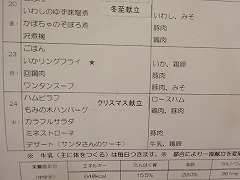 ↑ 今日は今年最後の給食、クリスマス給食です。ピラフにモミの木型のハンバーグ、スープ、そしてお楽しみケーキと楽しみなメニューでした。