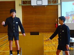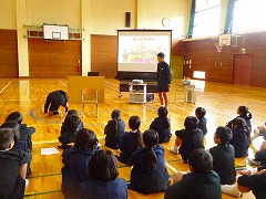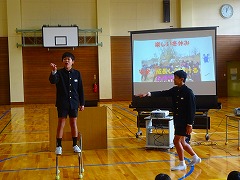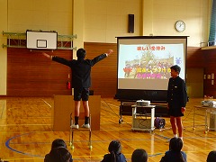↑ 引き続き笠野っ子集会です。6年生が国語で学習している狂言「柿山伏」を披露してくれました。セリフをすべて暗唱し、節をつけて謡うまでには、ずいぶんと練習したことでしょう。柿山伏についての説明もとても分かりやすかったです。日本の伝統芸能を味わうことができました。1年生から5年生が6年生になった時、この発表を思い出すことでしょう。素晴らい発表でした。