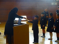 ↑ 2学期の終業式を行いました。2学期は一番長い学期でした。8月(葉月)、9月(長月)、10月(神無月)、11月(霜月)、12月(師走)実質は9月からですが、本当は8月1日から2学期が始まっていました。私からは、2学期みんなで成長できたことを振り返りました。それは、①「協力する心が高まったこと」協力とは自分の力を出し切ることで、運動会で学んだ協力を学校生活に生かしました。②「真剣な目で学習できたこと」真剣な目での学習で、できることがたくさん増えました。③「人権を意識できたこと」すべての人が幸せに生きる権利があることを理解して自分の言動を見直すことができました。