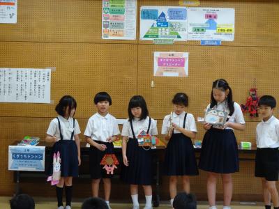 2年生が国語科「こんなものあったらいいな」の学習で,作文を1年生に発表しました。2年生が考えたあったらいいものは「タイムドア」「ふくをつくってくれるてんし」「スピードアップシューズ」「やさいとりざる」どれもユーモアあふれる楽しいものでした。本当にあったらいいな・・・。