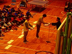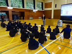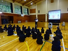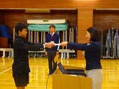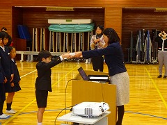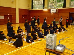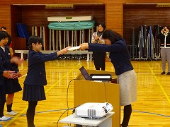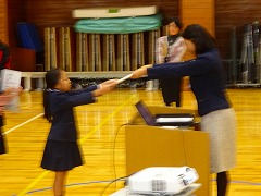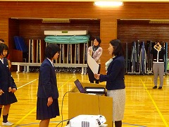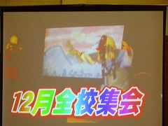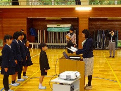 ↑ 12月全校集会 まず、県硬筆書写コンクールの会長賞、特選賞、入選賞、校内入選賞、図画工作展校内入選賞を表彰しました。これからもお手本を見て字が上達するように、また、創造力を膨らませ、粘り強く丁寧に絵を描くように頑張ってください。おめでとうございました。