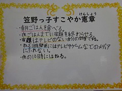 月曜日から「健康サイクルチェック」が始まります。「夜ご飯までに宿題を終わらせる」「夜10時までにはねる」「宿題はテレビのない静かな部屋でする」など、朝来たらセルフチェックをしていきます。規則正しい生活で元気に過ごすエネルギーが湧いてきます。笠野っ子みんなで取り組みましょう。笠野っ子が決めた「笠野っ子すこやか憲章」に、ご家族の皆さんもご協力よろしくお願いいたします。