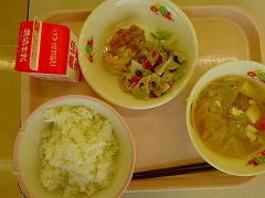 ↓今日の給食です。鶏肉の美味だれ、レンコンと小松菜の塩炒め、つみれ汁で温かくなり、そして、パワーが付きました!