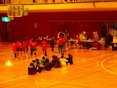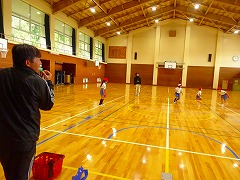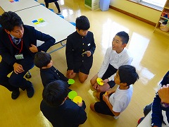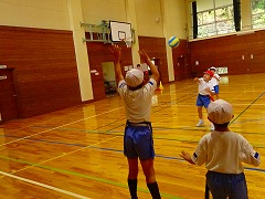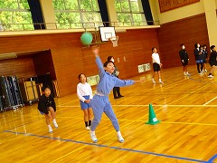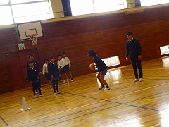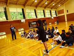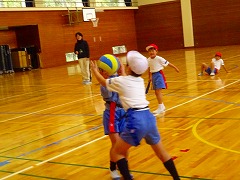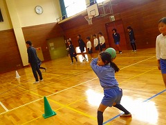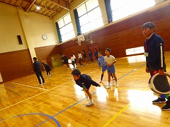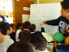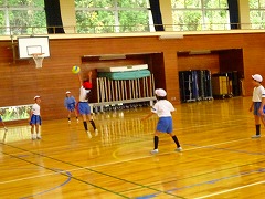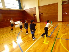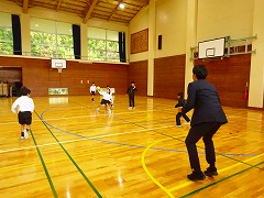 ↑ 1,2年合同でボールを使った運動です。これは、「トライゲーム」といって、本校のS教諭が開発したゲームです。タグラグビーのようなアメリカンフットボールのような「トライゲーム」です。ボールが苦手な子も得意な子も関係なく、お互いにはりきって掛け声を掛け合い、大変盛り上がっていました。とっても楽しいゲームです。