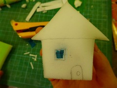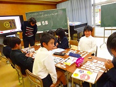 ↑ 2年図画工作 先生のモデルの作品はフルーツいっぱいのデコレーションケーキのすごろくです。動物ランドのすごろくやスポーツランドのすごろくを作っていました。出来上がりが楽しみです。