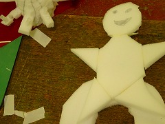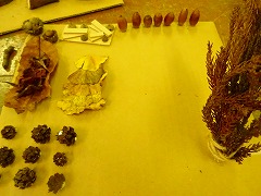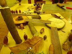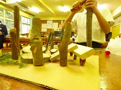 ↑ 3.4年図画工作 森のアートがずいぶん進みました。笠野の森から集めた自然の材料を加工して工作に使っています。自然の木にはエネルギーとぬくもりがあります。