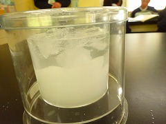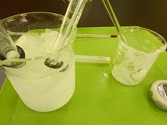 ↑4年理科 水は冷やし続けるとどうなるのだろうか、温度は?体積は? 冷やし続けると、0℃でこおりはじめ、0℃で氷になったということです。はじめはぐんぐん温度は下がりましたが、0℃の時間はおよそ6分ほどあったそうです。その後、マイナス9℃まで下がり続け、氷になったので体積は増えたということでした。実際に実験をしながら水の変化について学びを深めています。