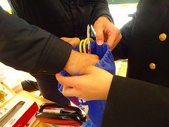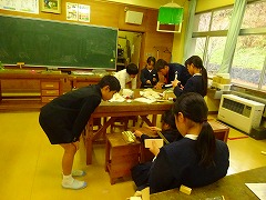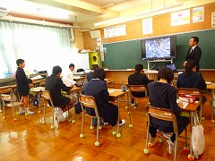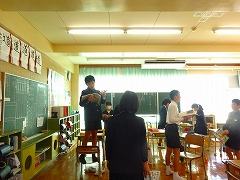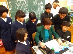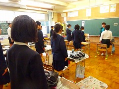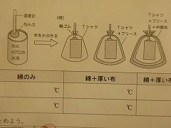 ↑ 6年家庭科 重ね着の保温効果の実験です。90℃のお湯を入れ物に入れ、一枚重ね、2枚重ね着、3枚重ね着させて、温度計でお湯の温度変化を実験しました。結果は、5分後にはもう明らかでした。重ね着無しは、5分後には20℃も温度が下がったのに対し、3枚重ね着のお湯は7℃下しか下がりませんでした。つまり、寒い冬は重ね着による保温効果は大きいということです。いま、環境問題が叫ばれています。重ね着をすることで、暖房によるエネルギー石油エネルギーの消費を少なくすることができます。重ね着をして保温し、暖房設定温度を1℃下げることで、世界の環境問題に大きく貢献できると思います。実践してみませんか。