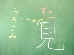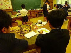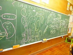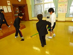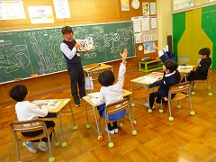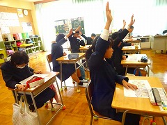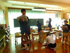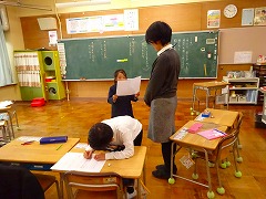 ↑ 6年国語 狂言「柿山伏」の音読練習です。伝統文化を楽しみ、狂言独特の言い回しから、昔の人のものの見方や考え方、感じ方を学んでいます。椅子の上に乗っているのは、山伏が柿を食べようと、柿の木に上がっている所を表現しています。