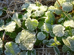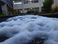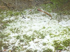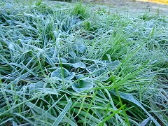 ↑ 午前中はうっすらと雪がに積もりました。緑の苔や茶色の里山ハウスの屋根が、白くなりました。