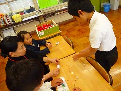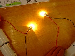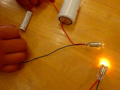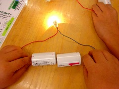 ↓ 3年理科 どうしたら豆電球に明かりがつくか、予想を立てて実験しました。乾電池の数によって、明るさが違うことも発見しました。